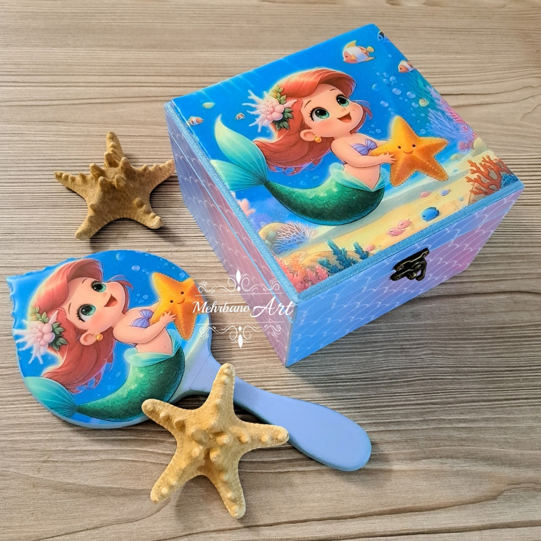 ست جعبه و آیینه چوبی دخترانه طرح پری دریایی با کاور رزینی