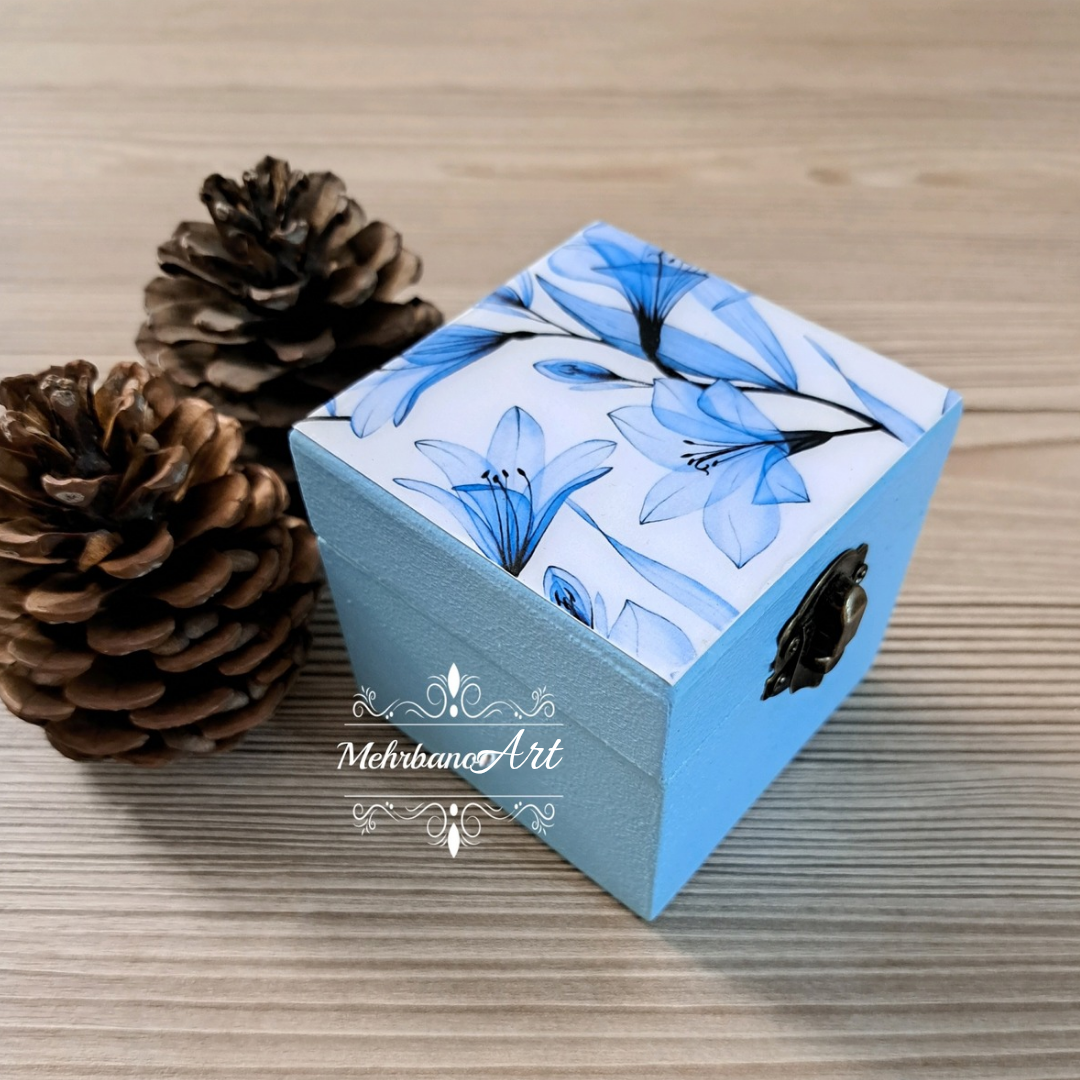 جعبه چوبی طرح گل آبی با کاور رزینی
