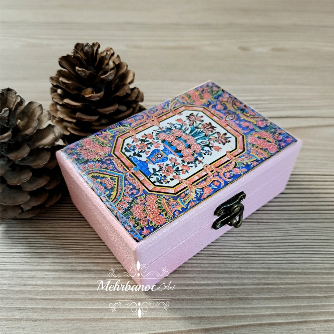 جعبه چوبی طرح گل کاشی سنتی با کاور رزینی