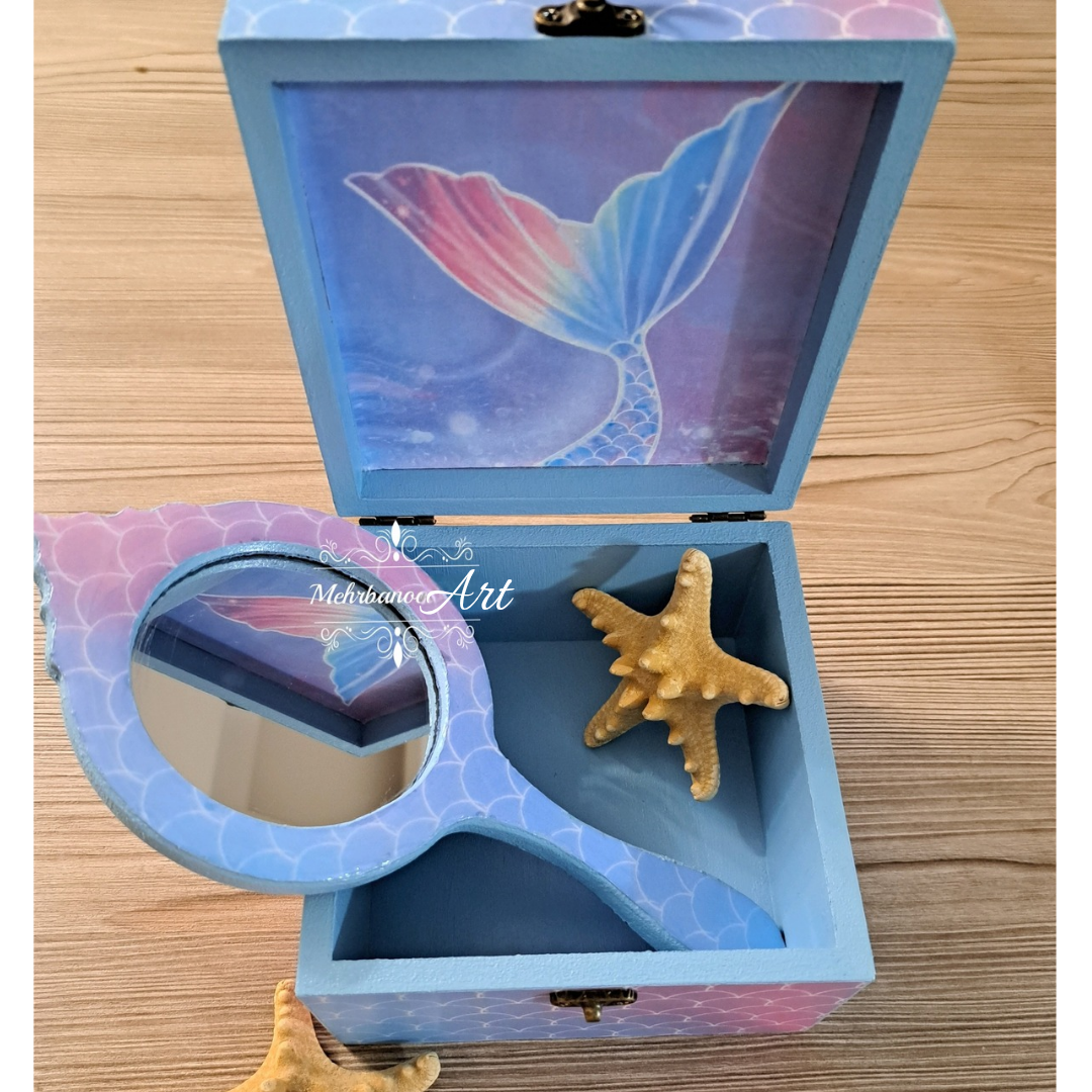 ست جعبه و آیینه چوبی دخترانه طرح پری دریایی با کاور رزینی